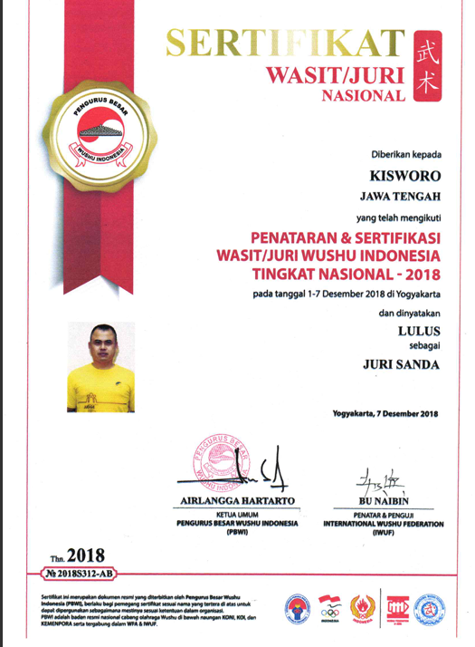 Sanda | Sertifikat Penataran Wasit/Juri Wushu Indonesia Tingkat Nasional Tahun 2018 | C Nasional |